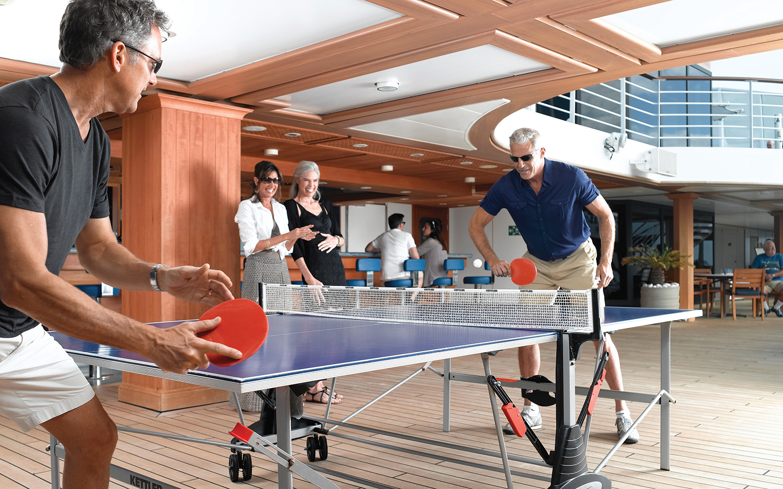 Wer es eher sportlich mag, wird sich auf dem Sport-Deck zuhause fühlen. Hoch über dem Schiff spielen Sie bei fantastischer Aussicht eine Partie Shuffleboard oder schlagen ein paar Bälle auf der Driving-Range und dem 18-Loch-Minigolfplatz.